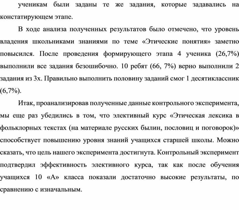 Итак, проанализировав полученные данные контрольного эксперимента, мы еще раз убедились в том, что элективный курс «Этическая лексика в фольклорных текстах (на материале русских былин, пословиц и поговорок)» способствует повышению уровня знаний учащихся старшей школы. Можно сказать, что цель нашего эксперимента достигнута. Контрольный эксперимент подтвердил эффективность элективного курса, так как после обучения учащихся 10 «А» класса показали достаточно высокие результаты, по сравнению с изначальным.