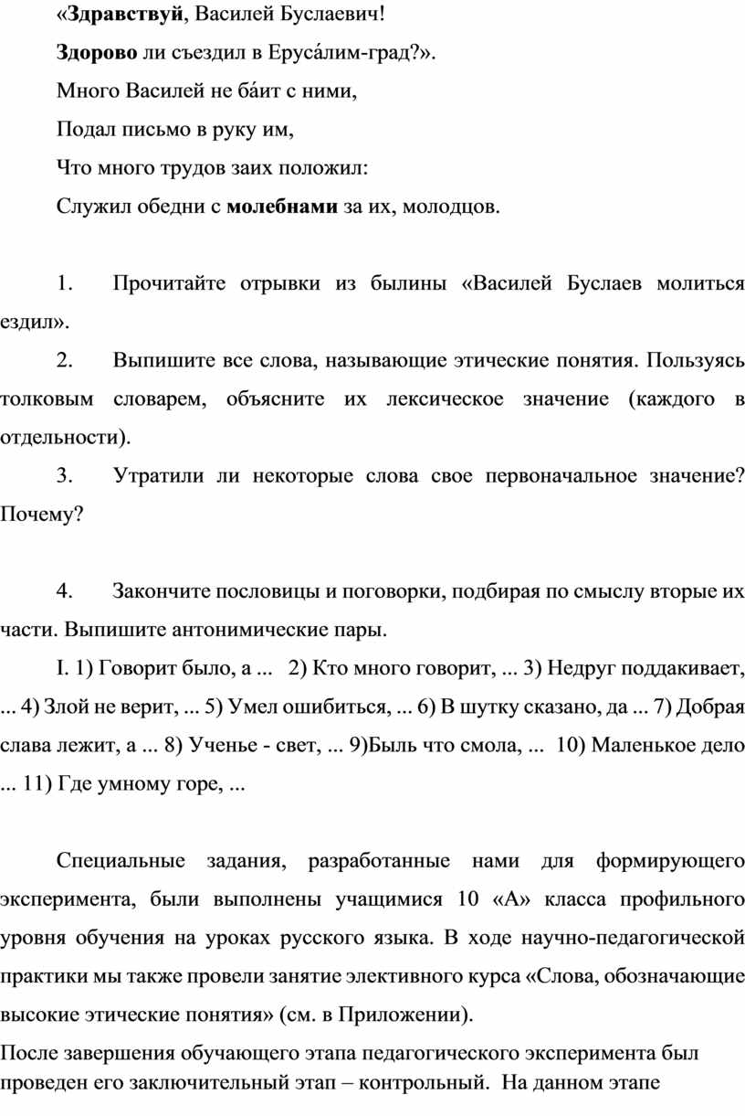 Специальные задания, разработанные нами для формирующего эксперимента, были выполнены учащимися 10 «А» класса профильного уровня обучения на уроках русского языка. В ходе научно-педагогической практики мы также провели занятие элективного курса «Слова, обозначающие высокие этические понятия» (см. в Приложении).