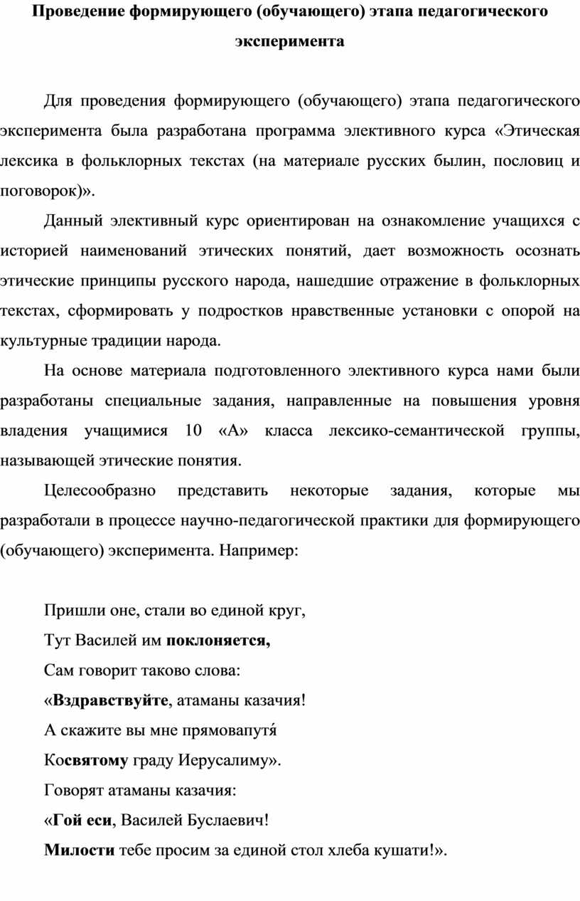 Для проведения формирующего (обучающего) этапа педагогического эксперимента была разработана программа элективного курса «Этическая лексика в фольклорных текстах (на материале русских былин, пословиц и поговорок)».