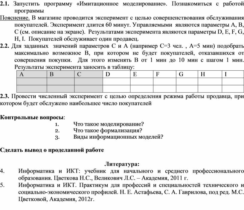 Пояснение. В магазине проводится эксперимент с целью совершенствования обслуживания покупателей. Эксперимент длится 60 минут. Управляемыми являются параметры А, В, С (см. описание на экране). Результатами эксперимента являются параметры D, E, F, G, H, I. Покупателей обслуживает один продавец.