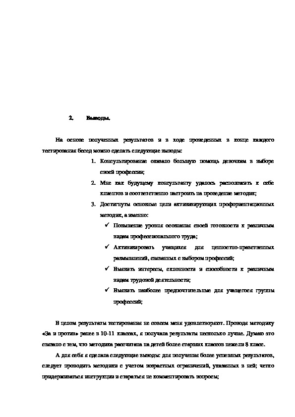 К сожалению, результаты по методике «За и против» оказались не совсем
