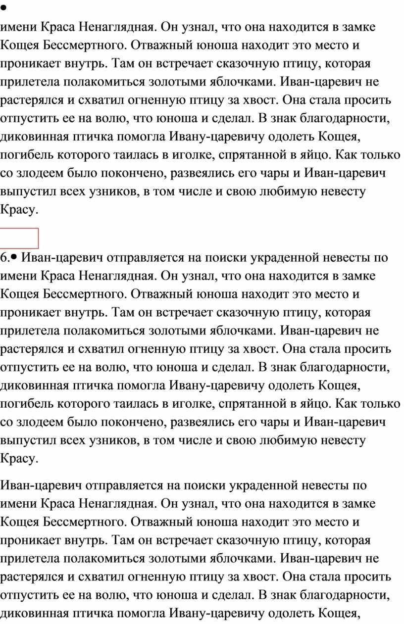 Иван-царевич отправляется на поиски украденной невесты по имени Краса Ненаглядная. Он узнал, что она находится в замке Кощея Бессмертного. Отважный юноша находит это место и проникает внутрь. Там он встречает сказочную птицу, которая прилетела полакомиться золотыми яблочками. Иван-царевич не растерялся и схватил огненную птицу за хвост. Она стала просить отпустить ее на волю, что юноша и сделал. В знак благодарности, диковинная птичка помогла Ивану-царевичу одолеть Кощея, погибель которого таилась в иголке, спрятанной в яйцо. Как только со злодеем было покончено, развеялись его чары и Иван-царевич выпустил всех узников, в том числе и свою любимую невесту Красу.