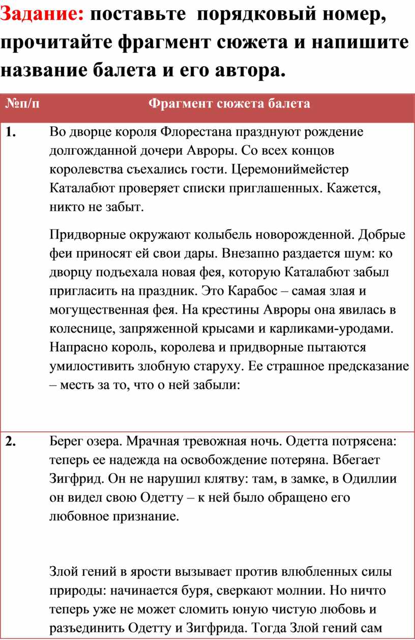 Задание: поставьте порядковый номер, прочитайте фрагмент сюжета и напишите название балета и его автора.