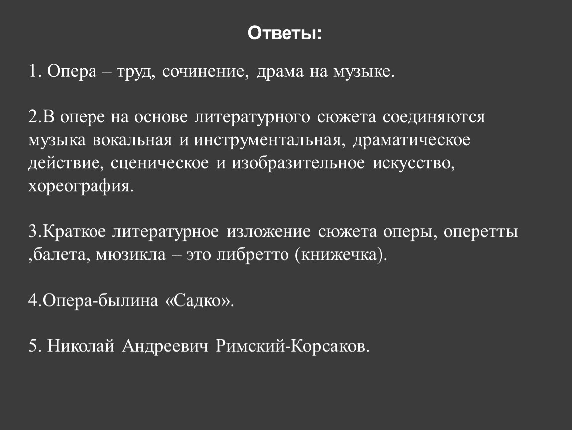 3.Краткое литературное изложение сюжета оперы, оперетты ,балета, мюзикла – это либретто (книжечка).