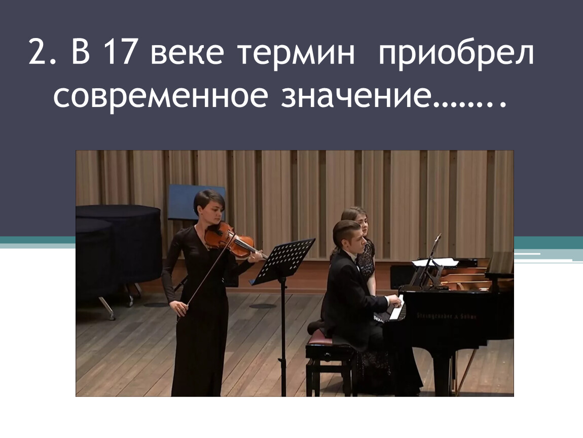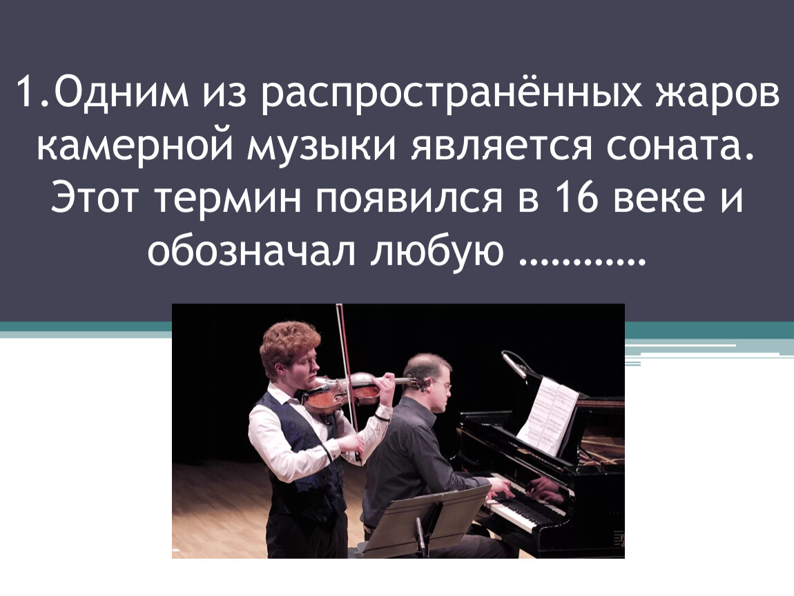 1.Одним из распространённых жаров камерной музыки является соната. Этот термин появился в 16 веке и обозначал любую …………