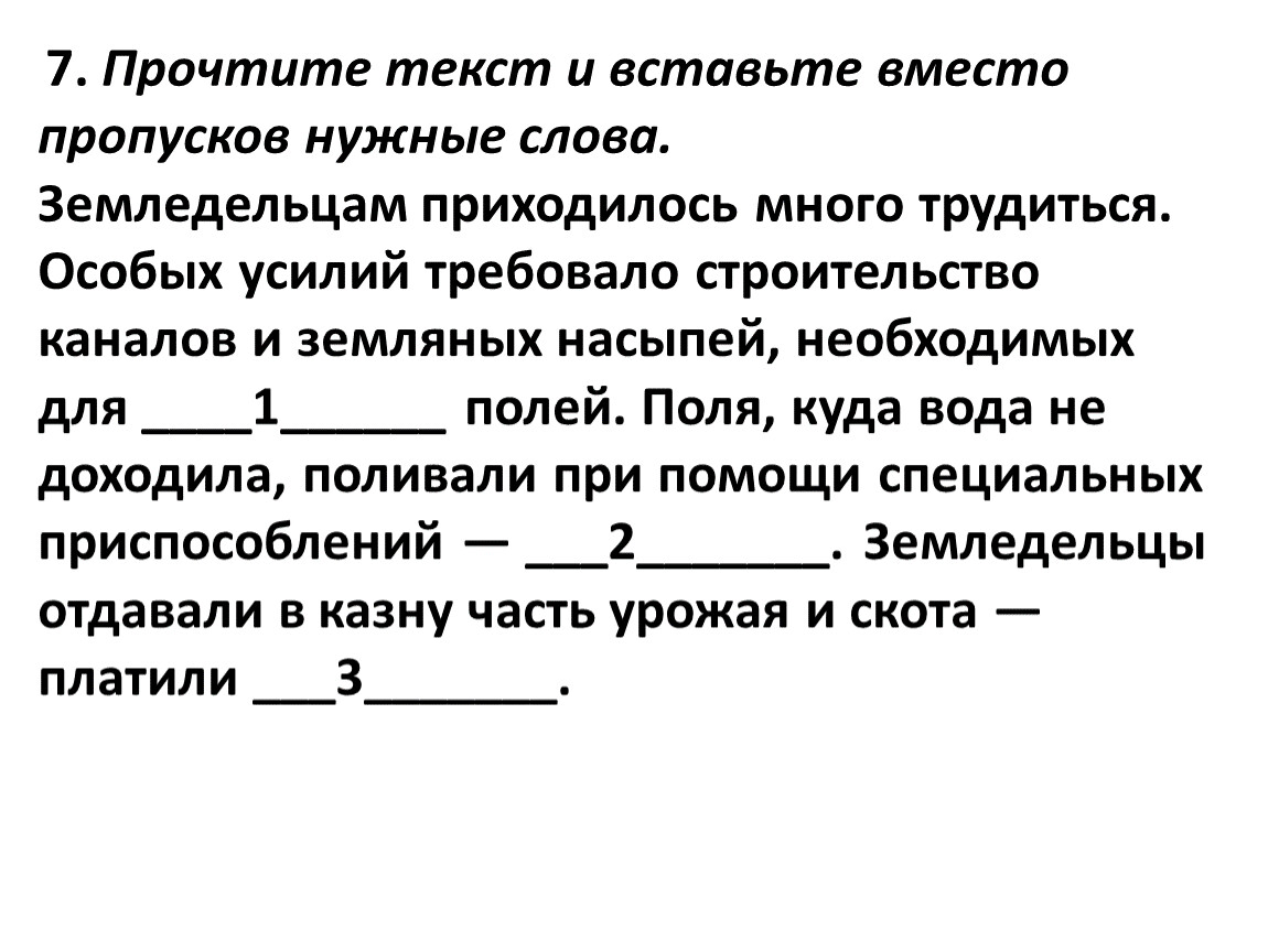 Земледельцам приходилось много трудиться. Особых усилий требовало строительство каналов и земляных насыпей, необходимых для ____1______ полей. Поля, куда вода не доходила, поливали при помощи специальных приспособлений — ___2_______. Земледельцы отдавали в казну часть урожая и скота — платили ___3_______.