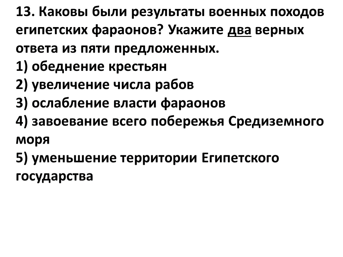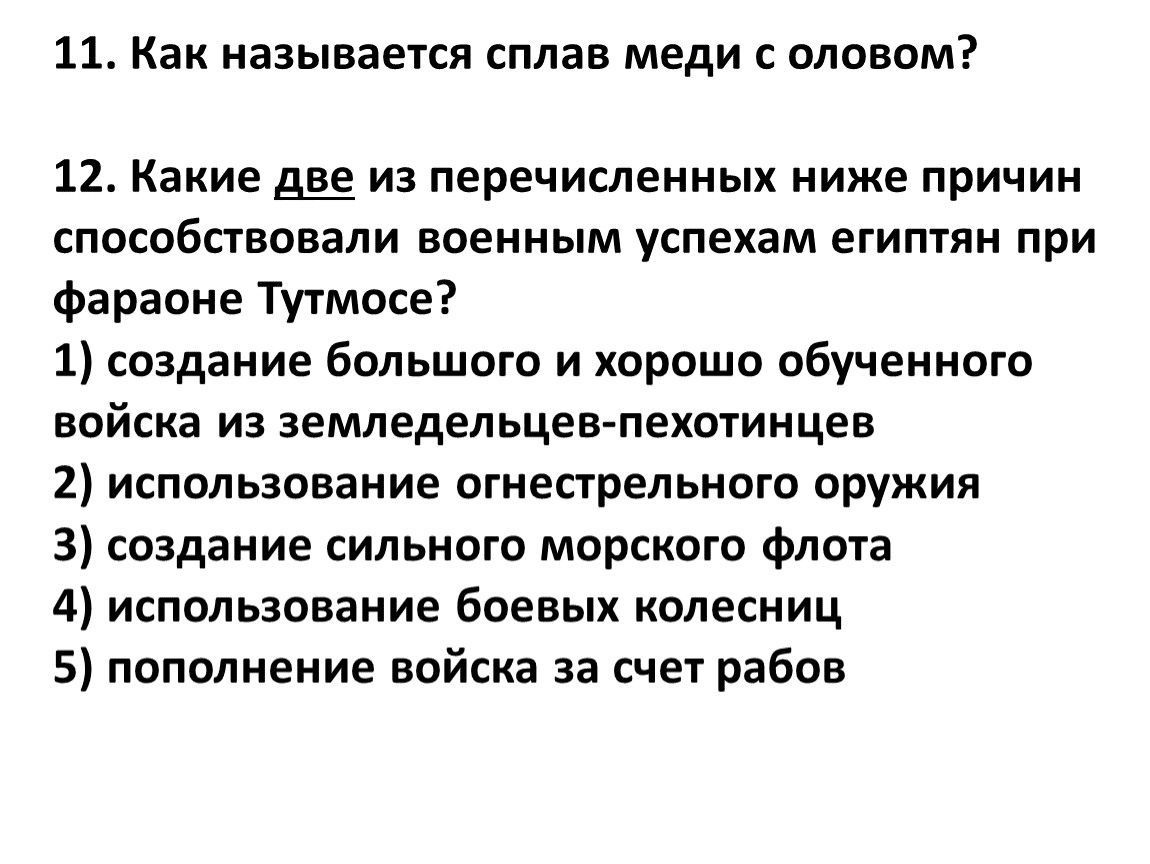 12. Какие две из перечисленных ниже причин способствовали военным успехам египтян при фараоне Тутмосе?