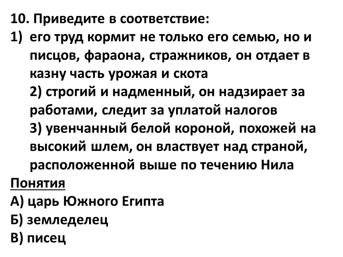 его труд кормит не только его семью, но и писцов, фараона, стражников, он отдает в казну часть урожая и скота2) строгий и надменный, он надзирает за работами, следит за уплатой налогов3) увенчанный белой короной, похожей на высокий шлем, он властвует над страной, расположенной выше по течению Нила