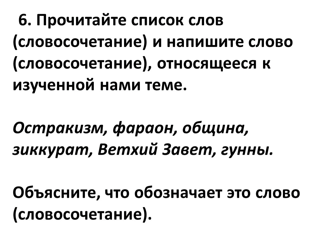 6. Прочитайте список слов (словосочетание) и напишите слово (словосочетание), относящееся к изученной нами теме.