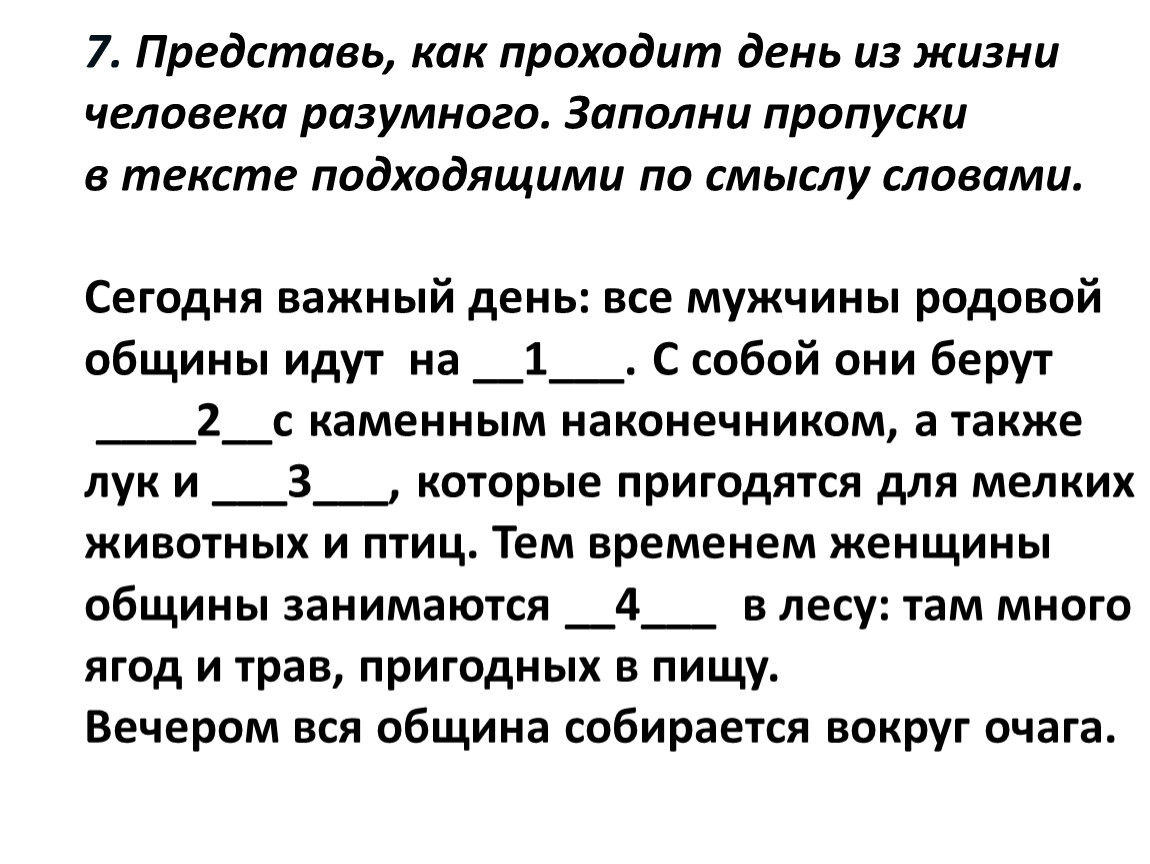 7. Представь, как проходит день из жизни человека разумного. Заполни пропуски в тексте подходящими по смыслу словами.