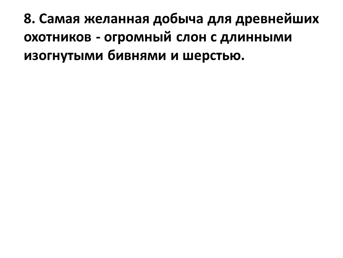 8. Самая желанная добыча для древнейших охотников - огромный слон с длинными изогнутыми бивнями и шерстью.