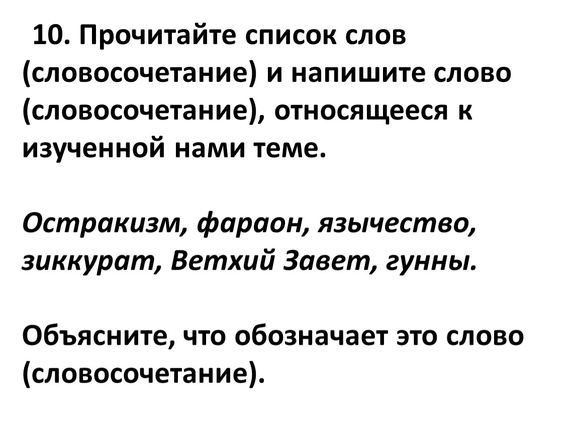 10. Прочитайте список слов (словосочетание) и напишите слово (словосочетание), относящееся к изученной нами теме.