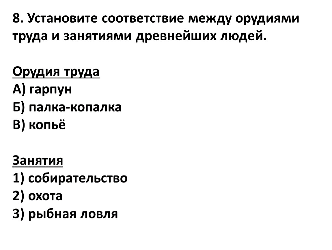 8. Установите соответствие между орудиями труда и занятиями древнейших людей.