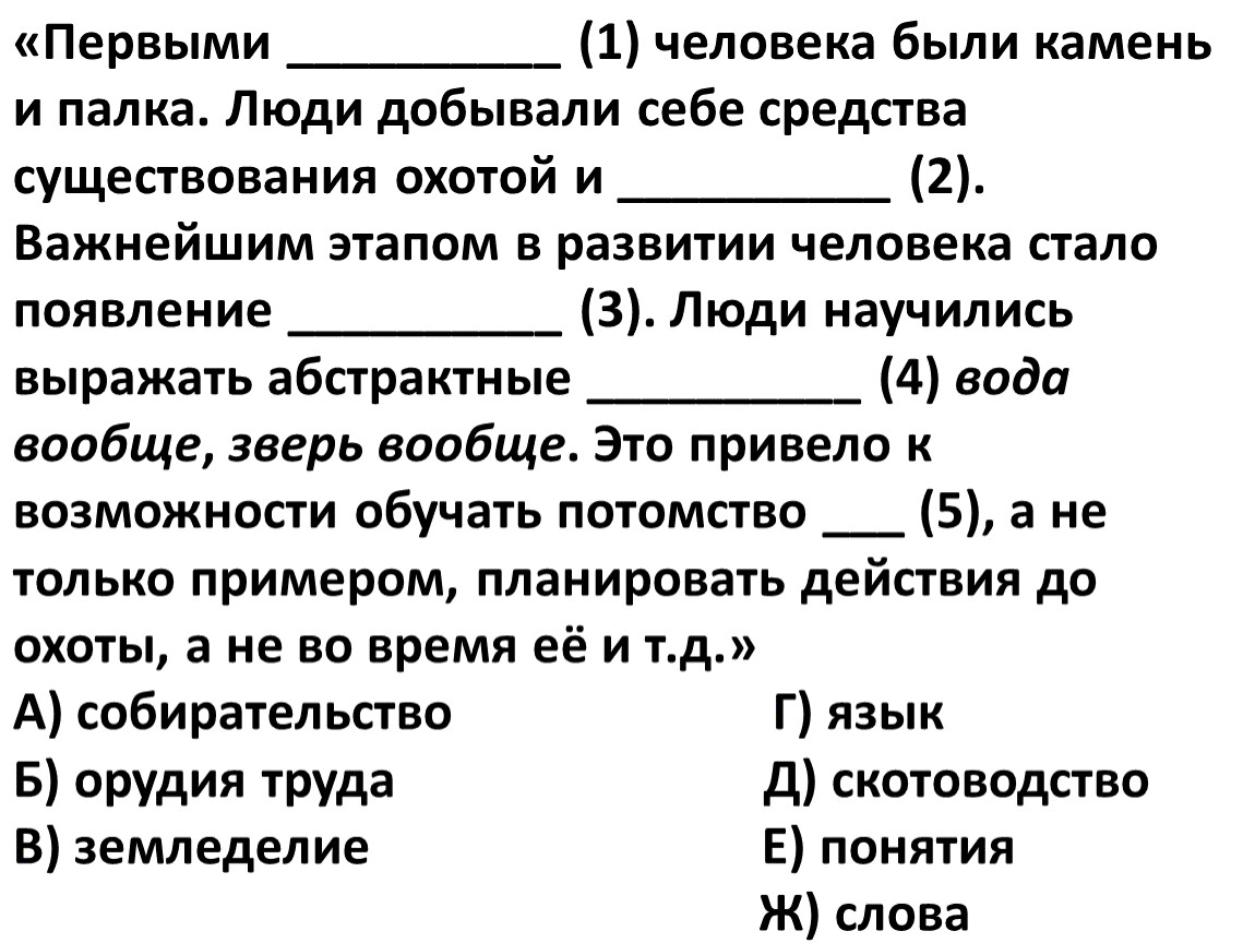 «Первыми __________ (1) человека были камень и палка. Люди добывали себе средства существования охотой и __________ (2). Важнейшим этапом в развитии человека стало появление __________ (3). Люди научились выражать абстрактные __________ (4) вода вообще, зверь вообще. Это привело к возможности обучать потомство ___ (5), а не только примером, планировать действия до охоты, а не во время её и т.д.»