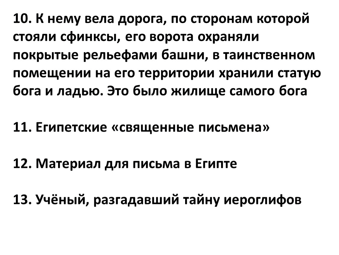 10. К нему вела дорога, по сторонам которой стояли сфинксы, его ворота охраняли покрытые рельефами башни, в таинственном помещении на его территории хранили статую бога и ладью. Это было жилище самого бога