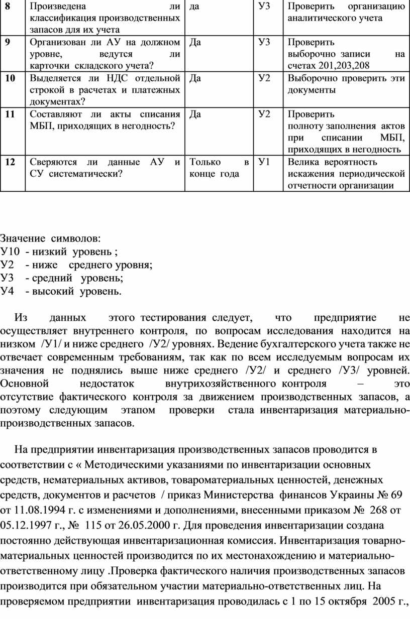 Из данных этого тестирования следует, что предприятие не осуществляет внутреннего контроля, по вопросам исследования находится на низком /У1/ и ниже среднего /У2/ уровнях. Ведение бухгалтерского учета также не отвечает современным требованиям, так как по всем исследуемым вопросам их значения не поднялись выше ниже среднего /У2/ и среднего /У3/ уровней. Основной недостаток внутрихозяйственного контроля – это отсутствие фактического контроля за движением производственных запасов, а поэтому следующим этапом проверки стала инвентаризация материально-производственных запасов.