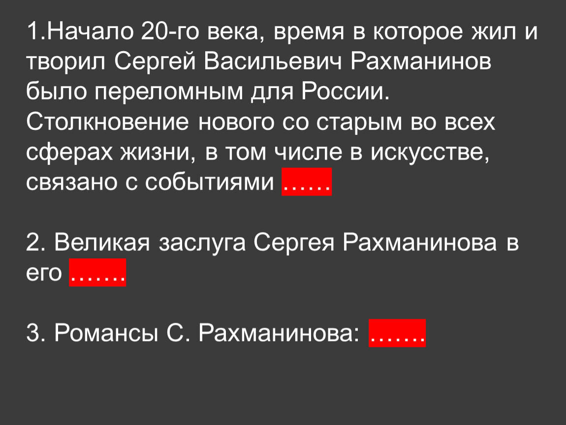 1.Начало 20-го века, время в которое жил и творил Сергей Васильевич Рахманинов было переломным для России. Столкновение нового со старым во всех сферах жизни, в том числе в искусстве, связано с событиями ……
