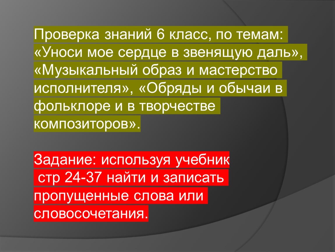 Проверка знаний 6 класс, по темам: «Уноси мое сердце в звенящую даль», «Музыкальный образ и мастерство исполнителя», «Обряды и обычаи в фольклоре и в творчестве композиторов».