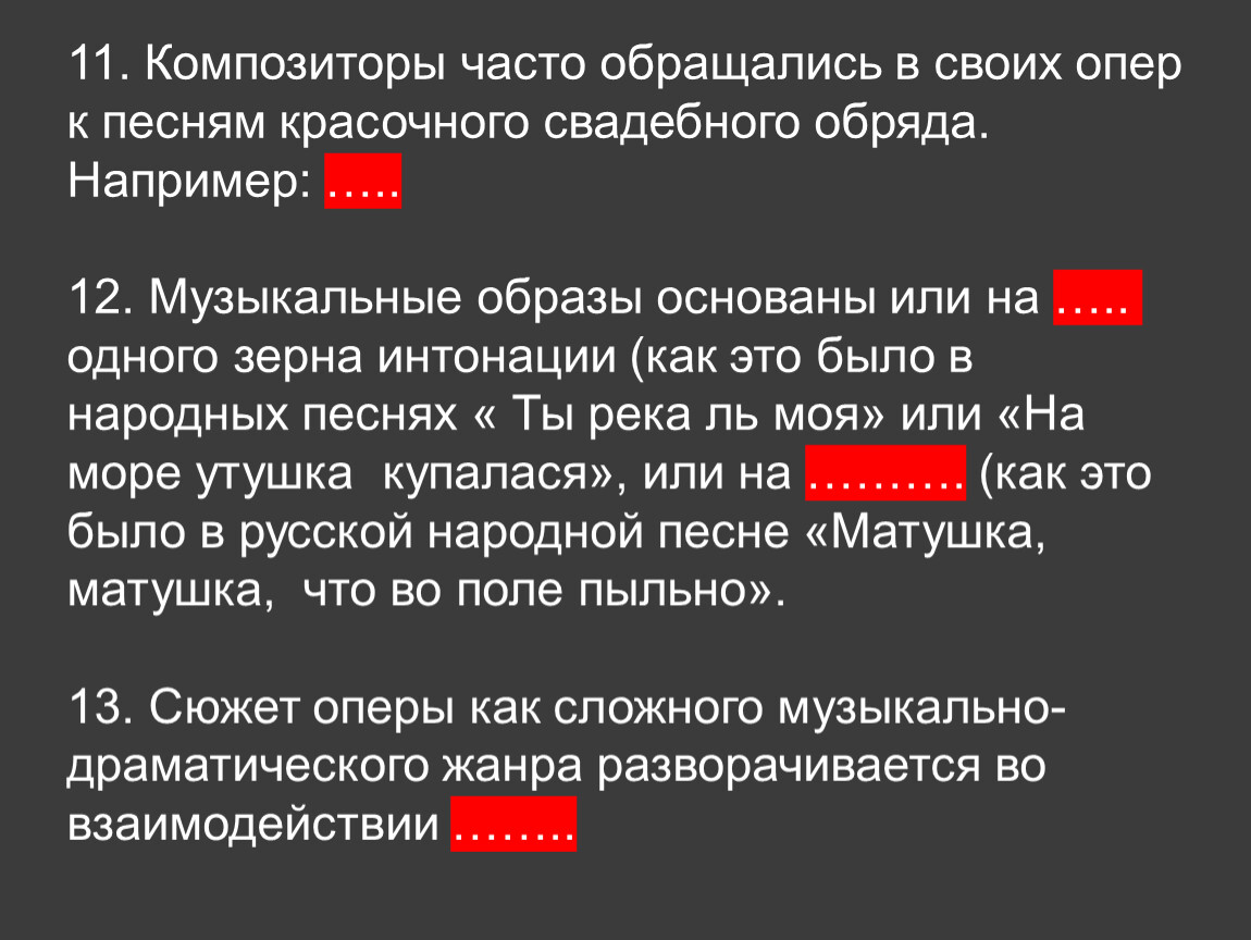 11. Композиторы часто обращались в своих опер к песням красочного свадебного обряда. Например: …..