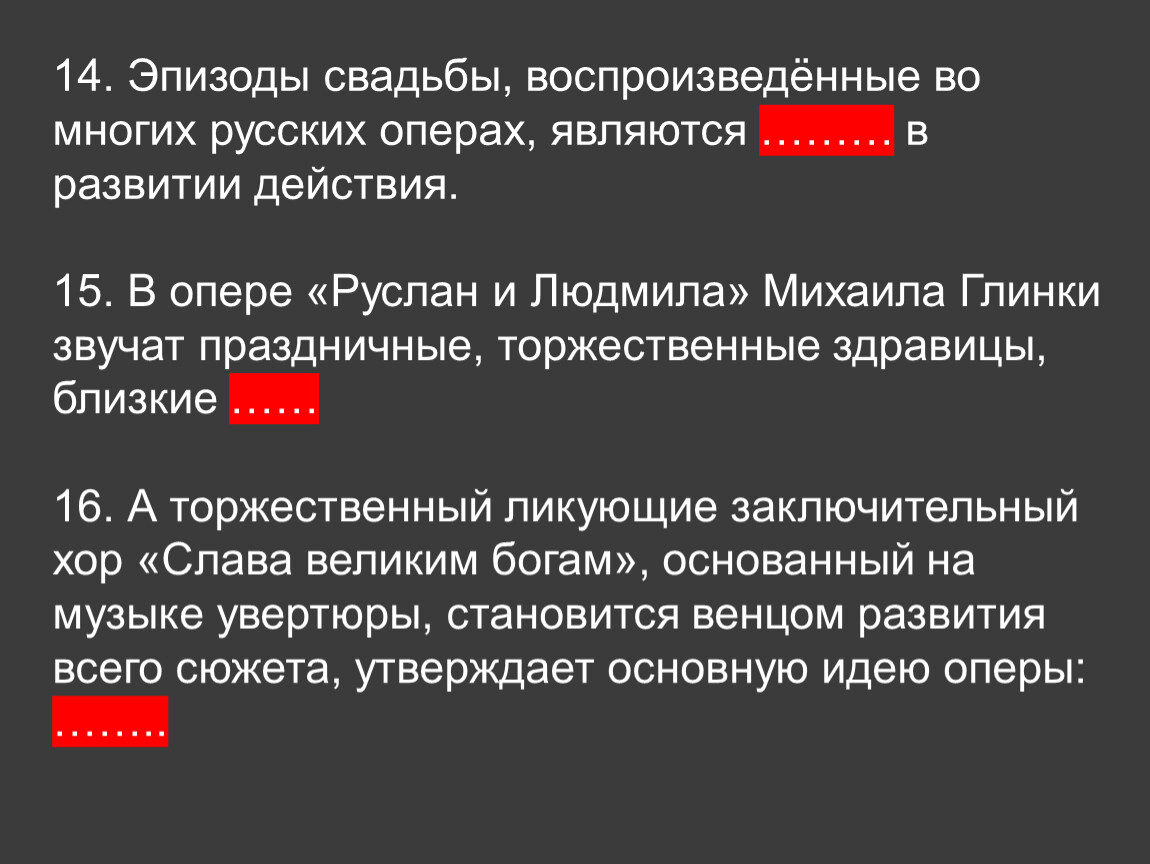 14. Эпизоды свадьбы, воспроизведённые во многих русских операх, являются ……… в развитии действия.
