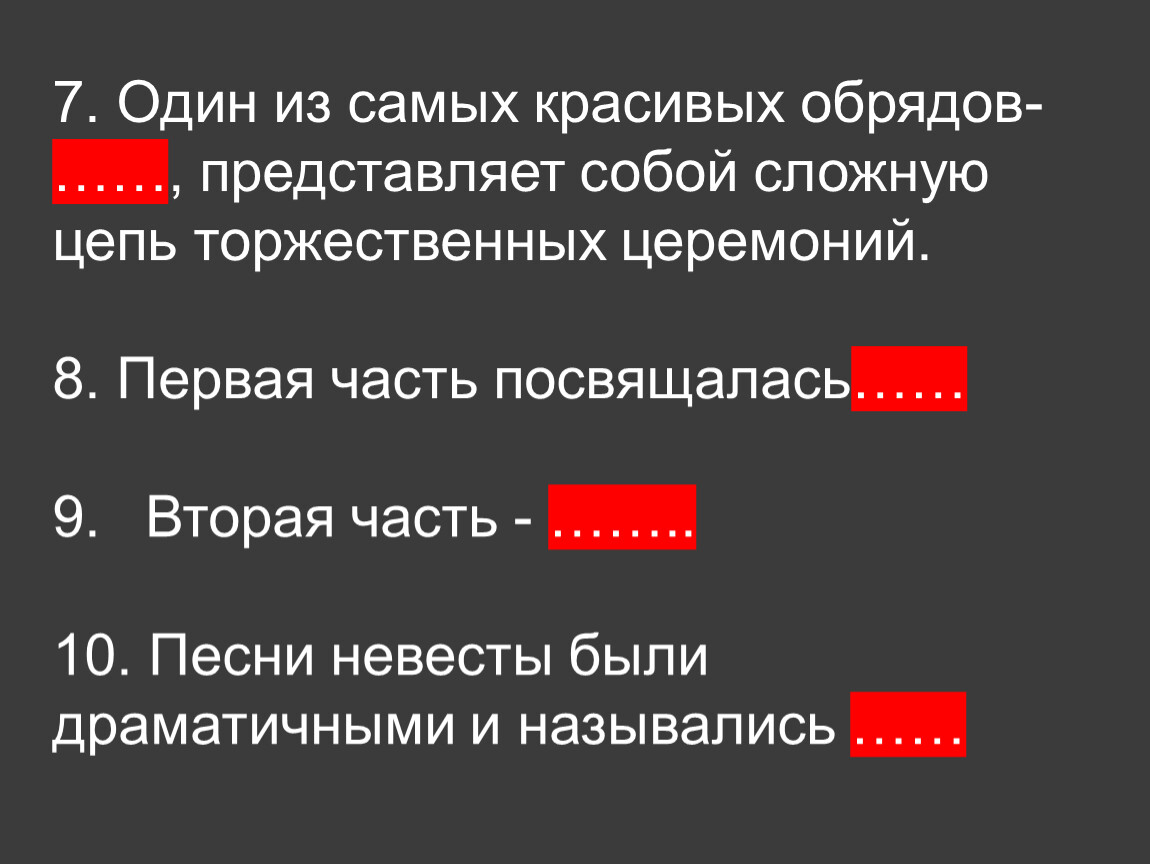 7. Один из самых красивых обрядов-……, представляет собой сложную цепь торжественных церемоний.