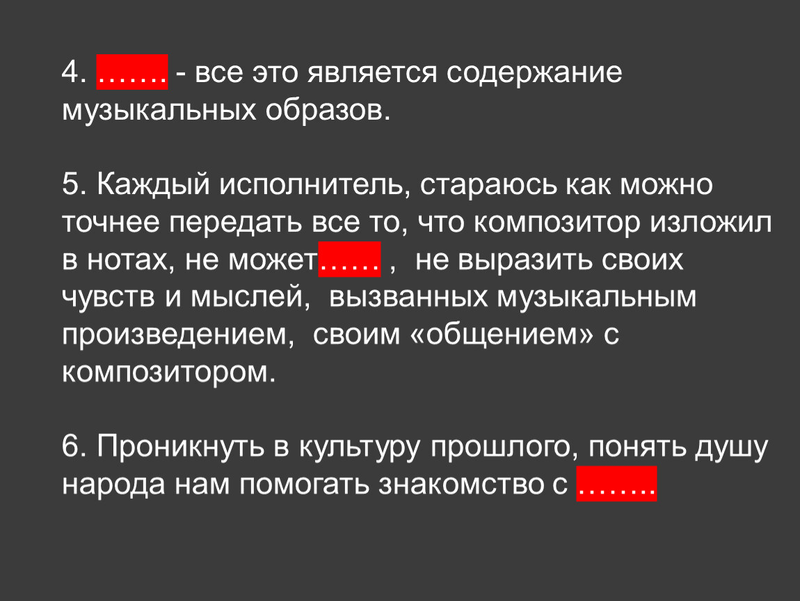 5. Каждый исполнитель, стараюсь как можно точнее передать все то, что композитор изложил в нотах, не может…… , не выразить своих чувств и мыслей, вызванных музыкальным произведением, своим «общением» с композитором.