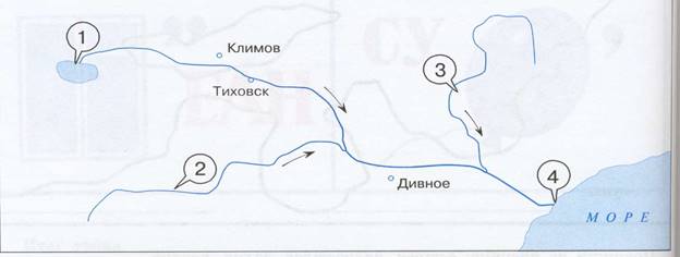 16. Рассмотрите рисунок. Какие части реки обозначены цифрами? На каком берегу стоит город Тиховск?