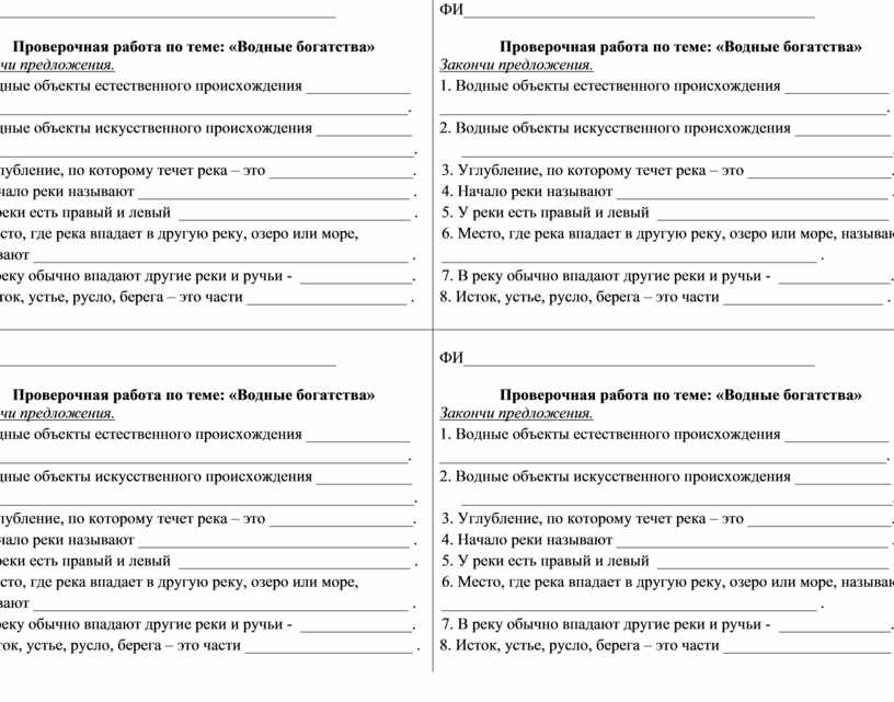 Проверочная работа по теме: «Водные богатства» Закончи предложения. 1. Водные объекты