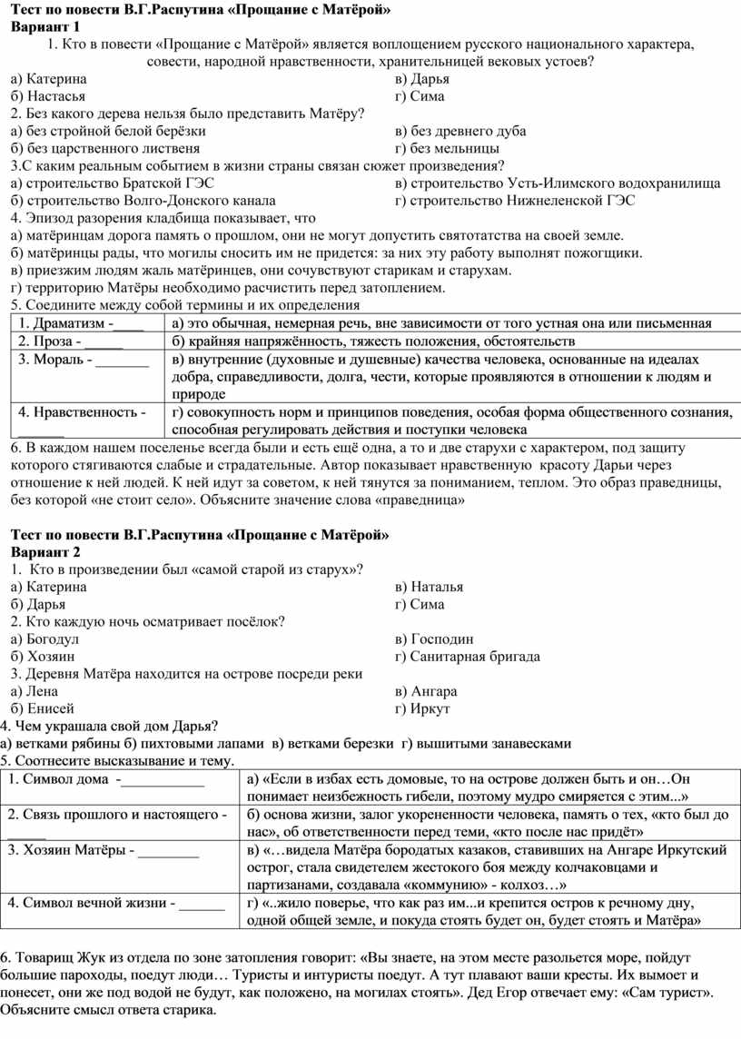 Тест по повести В.Г.Распутина «Прощание с Матёрой»