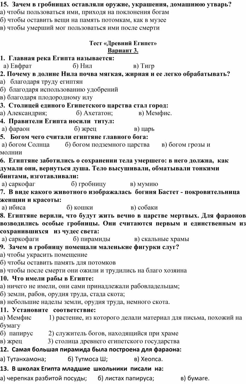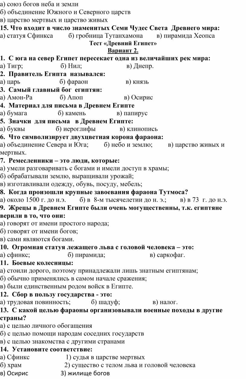 Проверочная работа по теме: «Древний Египет». 5 класс.
