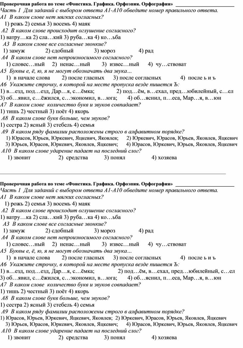 Проверочная работа по теме «Фонетика. Графика. Орфоэпия. Орфография» ____________________