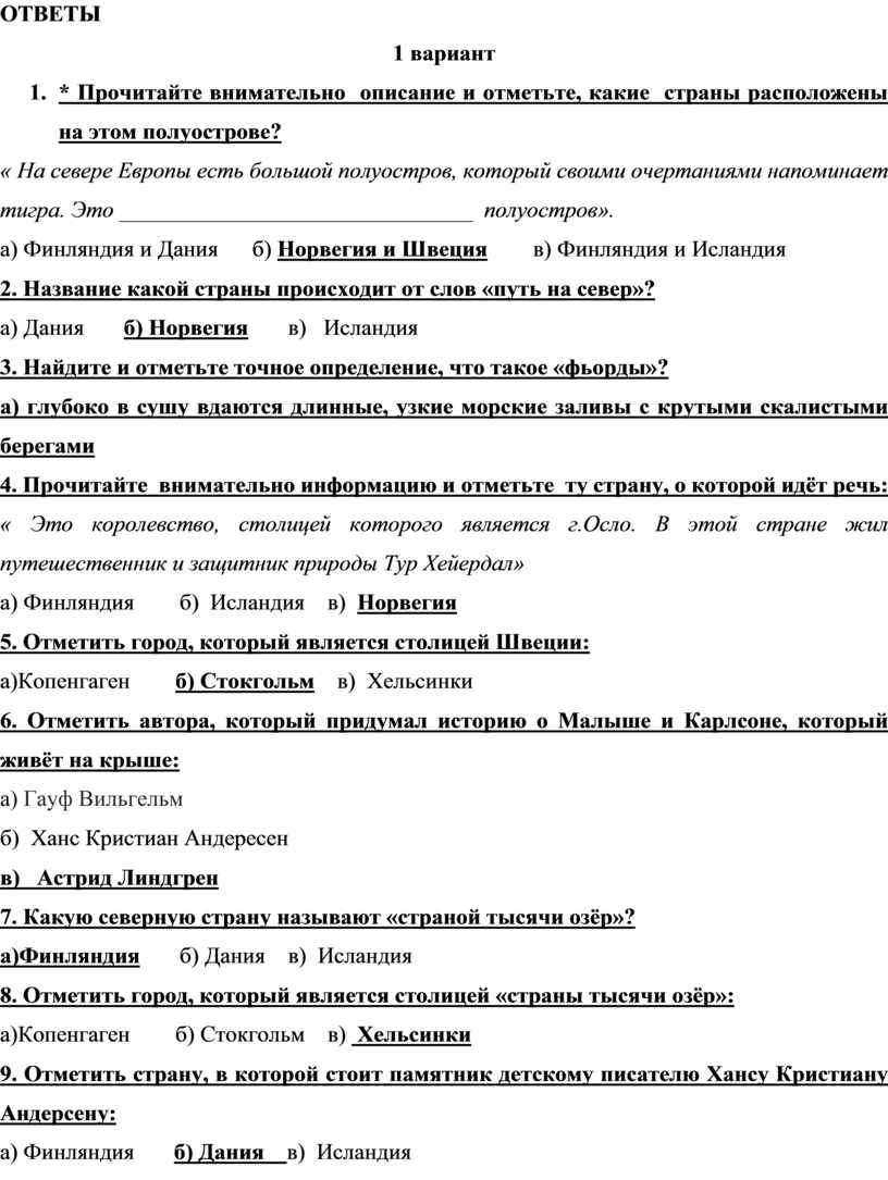 7. Памятник детскому писателю Хансу Кристиану Андерсену установлен: а) Финляндия б) Дания в) Исландия