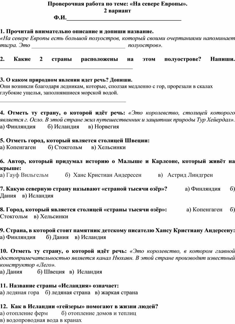 7. Какую северную страну называют «страной тысячи озёр»? а) Финляндия б) Дания в) Исландия