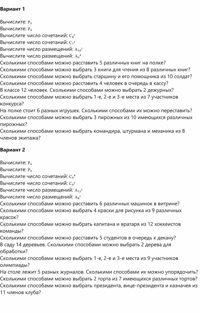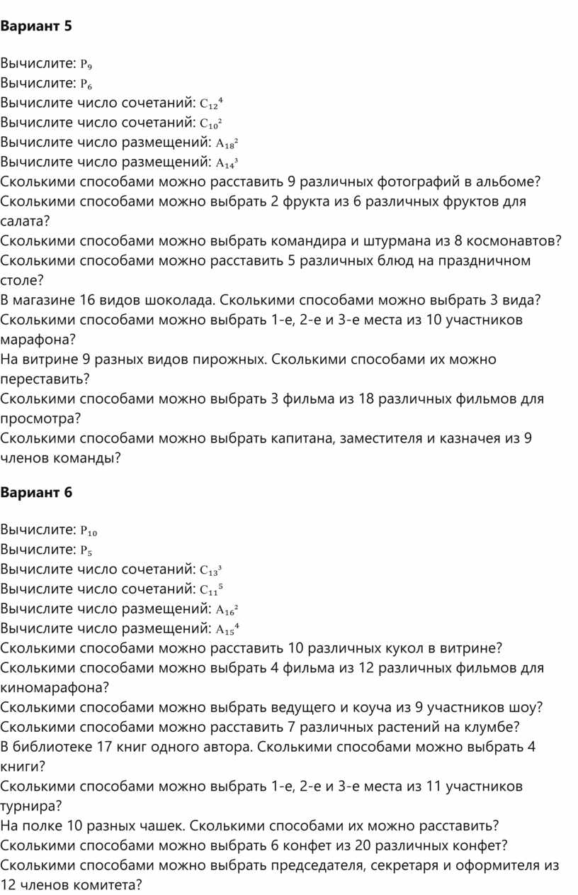 Вариант 6 1. 3628800 2. 120 3. 286 4. 462 5. 240 6. 32760 7. P₁₀ = 3628800 8. C₁₂⁴ = 495 9. A₉² = 72 10. P₇ = 5040 11. C₁₇⁴ = 2380 12. A₁₁³ = 990 13. P₁₀ = 3628800 14. C₂₀⁶ = 38760 15. A₁₂³ = 1320