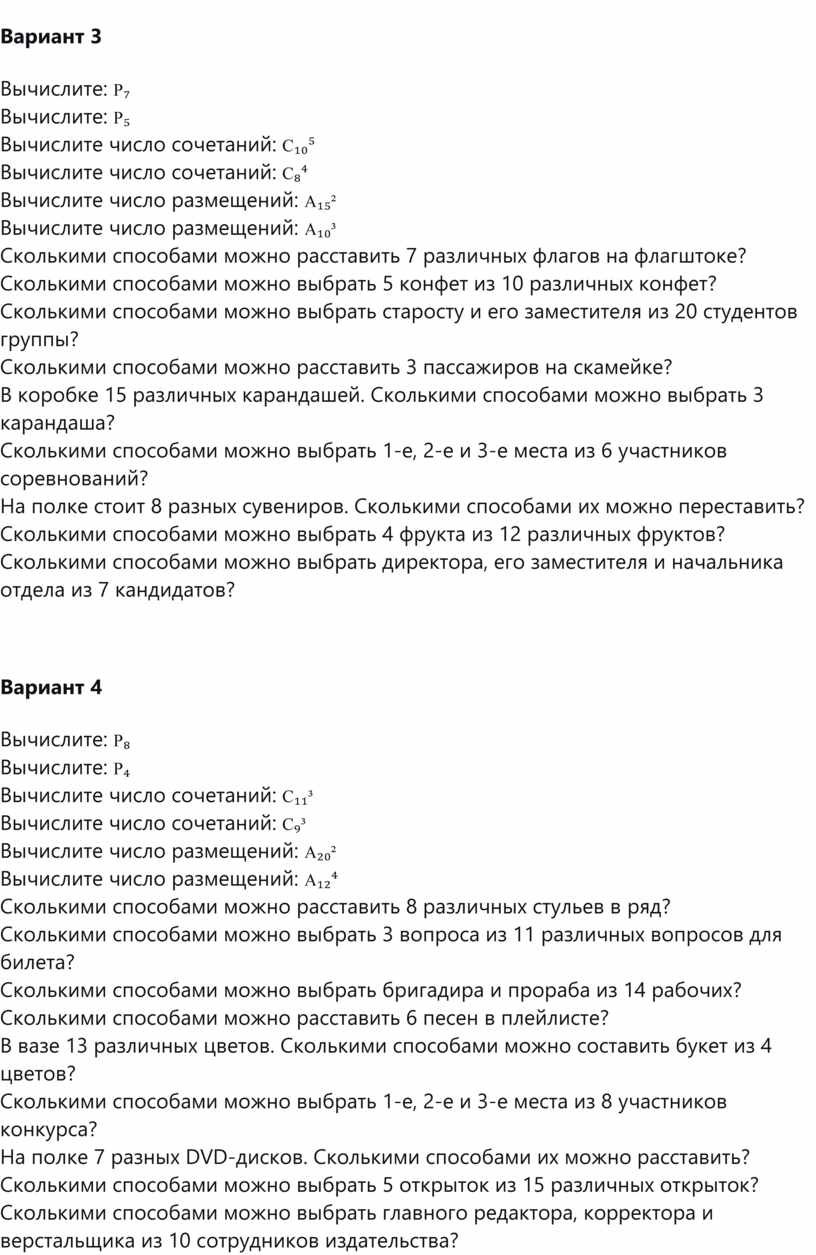 Вариант 4 1. 40320 2. 24 3. 165 4. 84 5. 380 6. 11880 7. P₈ = 40320 8. C₁₁³ = 165 9. A₁₄² = 182 10. P₆ = 720 11. C₁₃⁴ = 715 12. A₈³ = 336 13. P₇ = 5040 14. C₁₅⁵ = 3003 15. A₁₀³ = 720