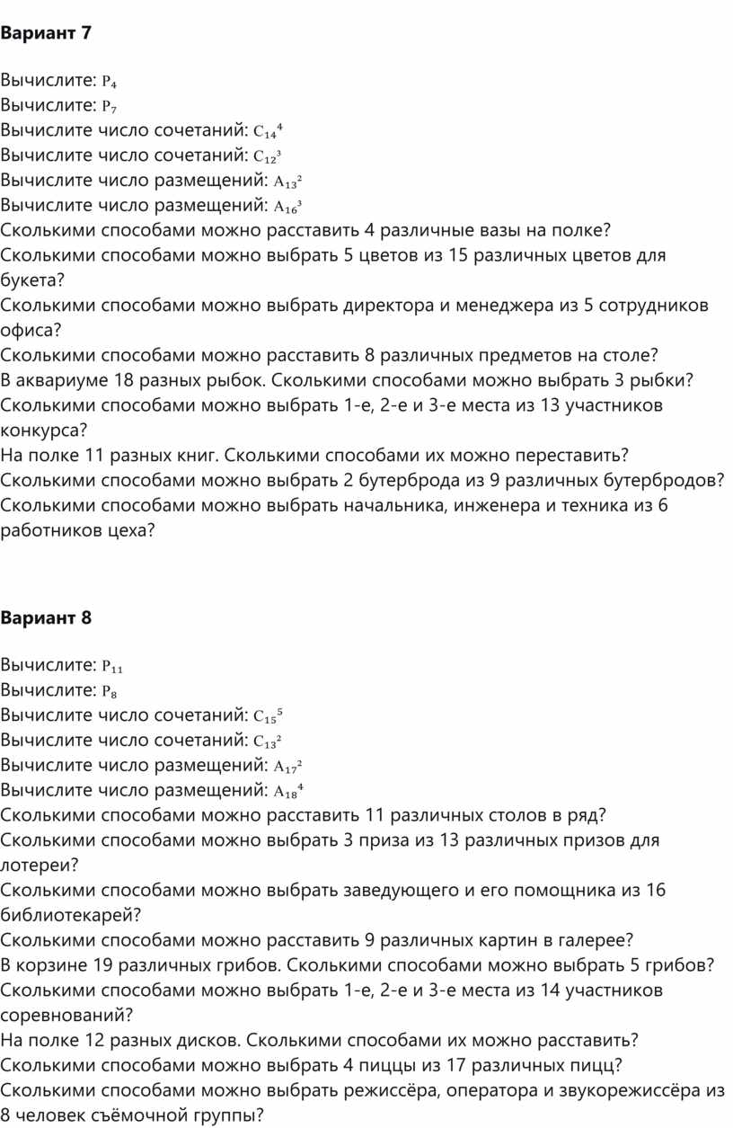 Вариант 7 1. 24 2. 5040 3. 1001 4. 220 5. 156 6. 3360 7. P₄ = 24 8. C₁₅⁵ = 3003 9. A₅² = 20 10. P₈ = 40320 11. C₁₈³ = 816 12. A₁₃³ = 1716 13. P₁₁ = 39916800 14. C₉² = 36 15. A₆³ = 120
