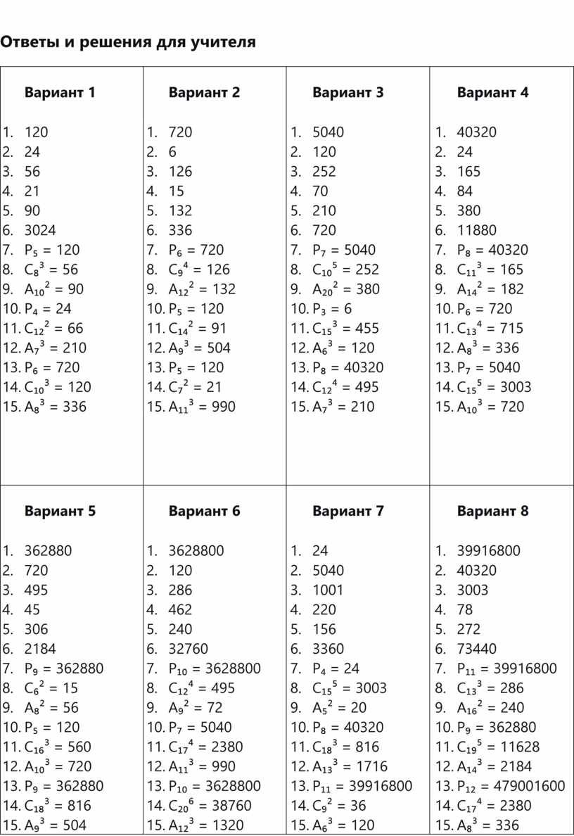 Вариант 2 1. 720 2. 6 3. 126 4. 15 5. 132 6. 336 7. P₆ = 720 8. C₉⁴ = 126 9. A₁₂² = 132 10. P₅ = 120 11. C₁₄² = 91 12. A₉³ = 504 13. P₅ = 120 14. C₇² = 21 15. A₁₁³ = 990
