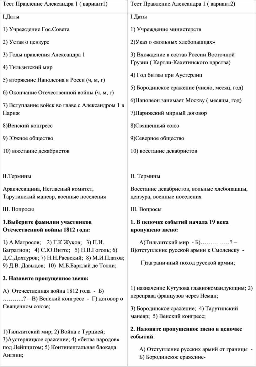 II.Термины Аракчеевщина, Негласный комитет, Тарутинский маневр, военные поселения III. Вопросы 1.Выберите фамилии участников Отечественной войны 1812 года: 1) А.Матросов; 2) Г.К Жуков; 3) П.И. Багратион; 4) С.Ю.Витте; 5) Н.В.Гоголь; 6) Д.С.Дохтуров; 7) Н.Н.Раевский; 8) М.И.Платов; 9) Д.В. Давыдов; 10) М.Б.Барклай де Толли; 2. Назовите пропущенное звено: А) Отечественная война 1812 года - Б) ………..? – В) Венский конгресс - Г) договор о Священном союзе;