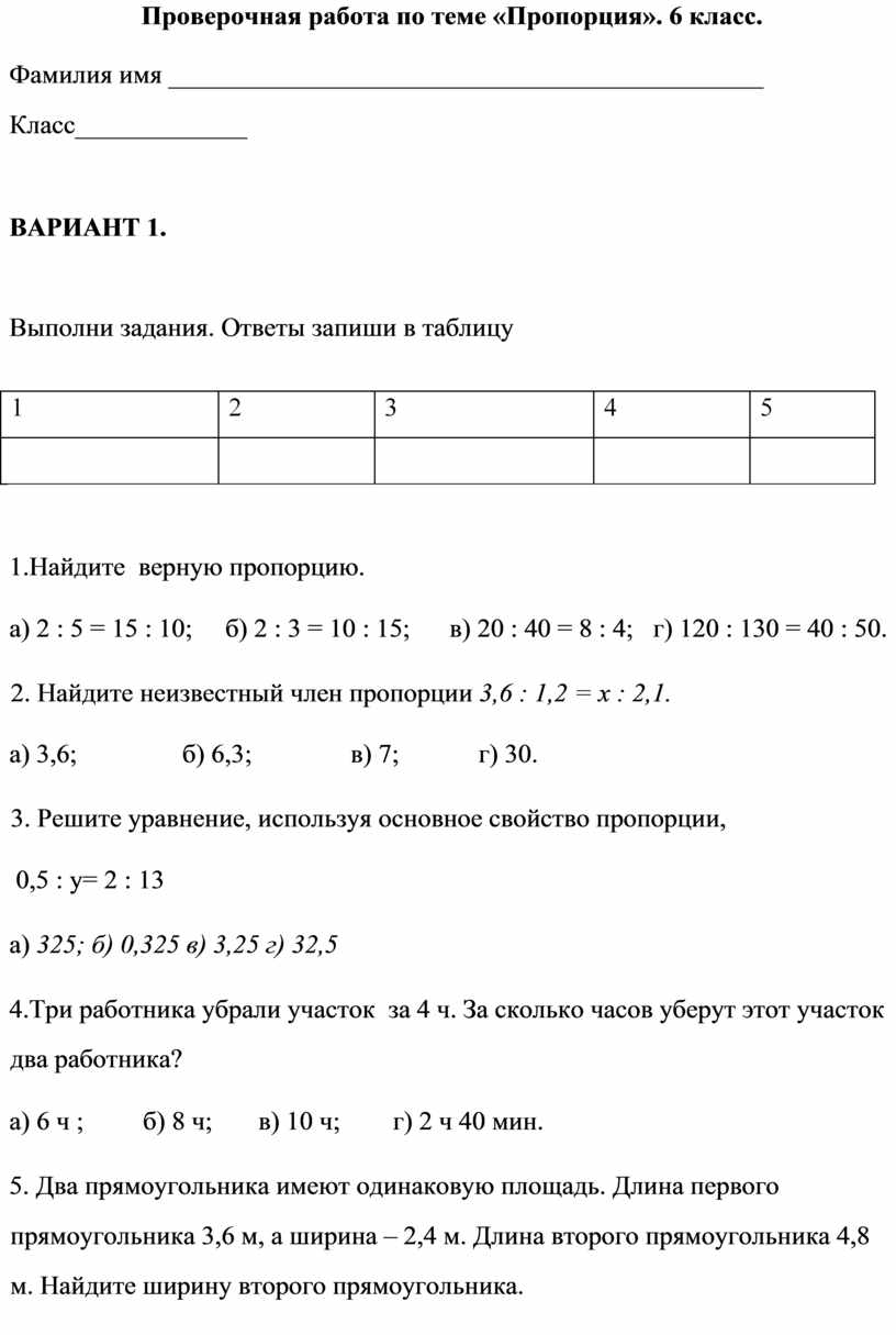 Проверочная работа по теме «Пропорция». 6 класс.