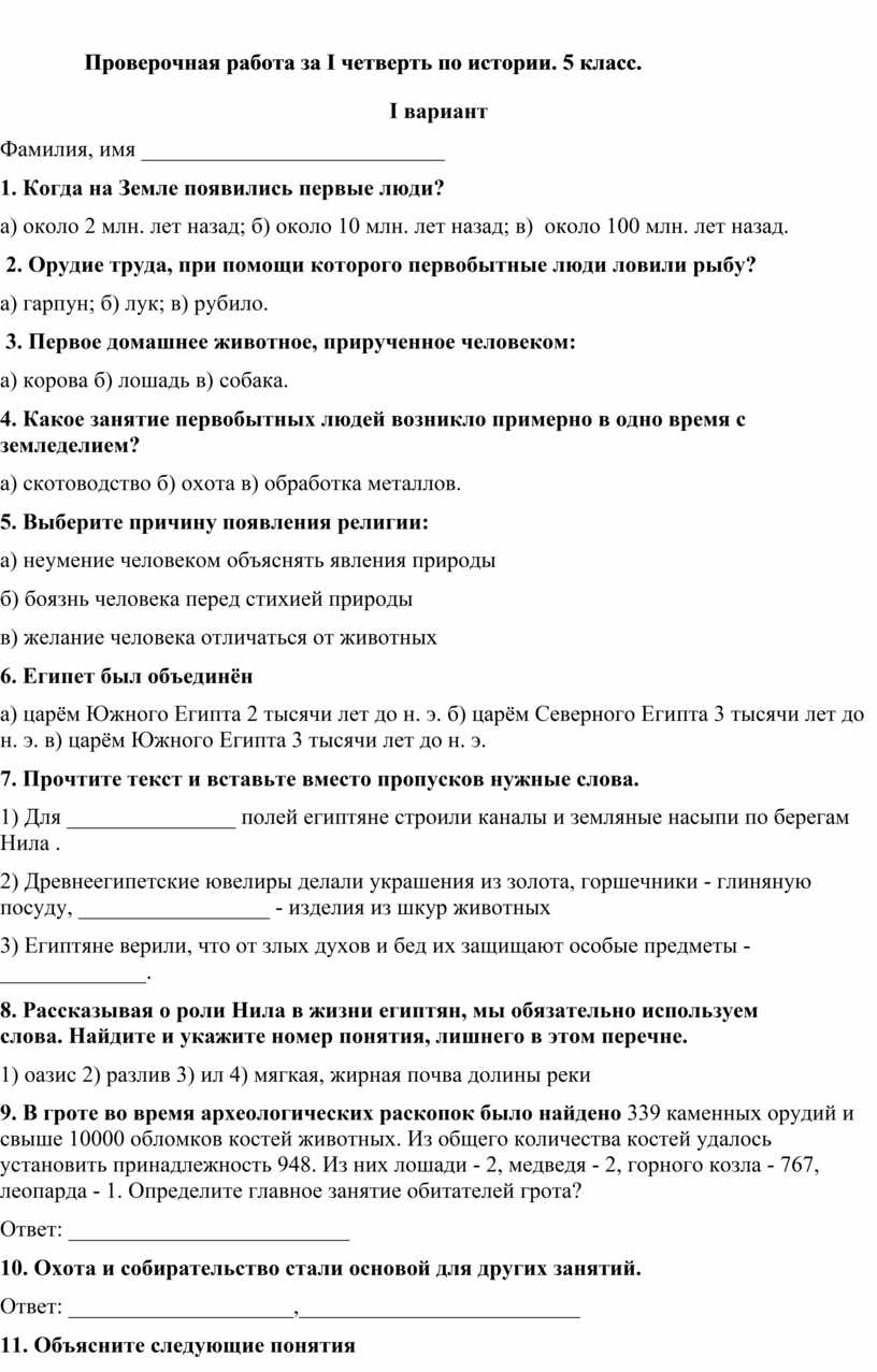 Проверочная работа за I четверть по истории. 5 класс.