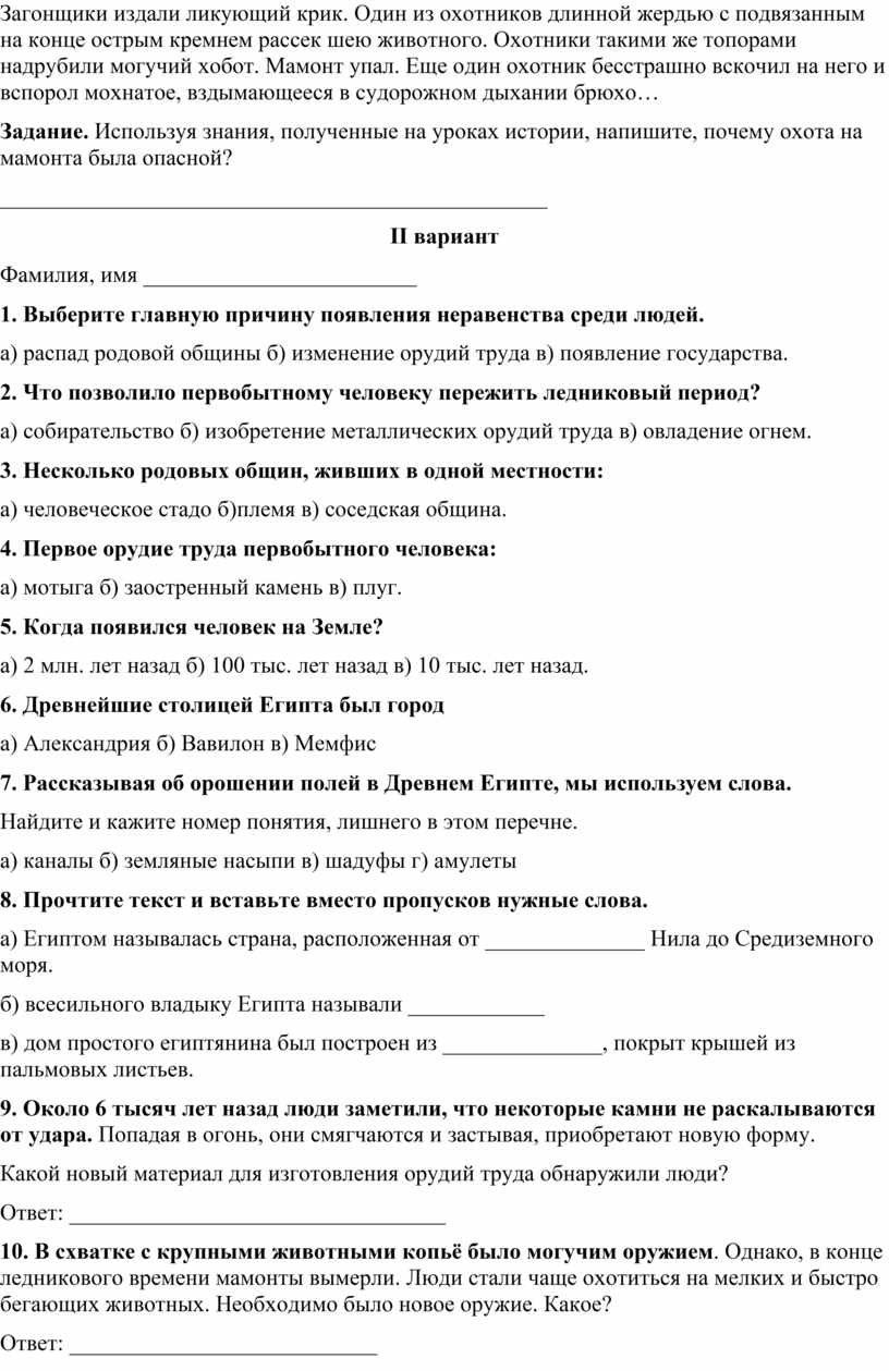 1 вариант. “Мамонт – могучее животное, и людям было очень трудно с ним справиться, имея лишь дубины, каменные топоры, ножи, копья с каменными наконечниками”