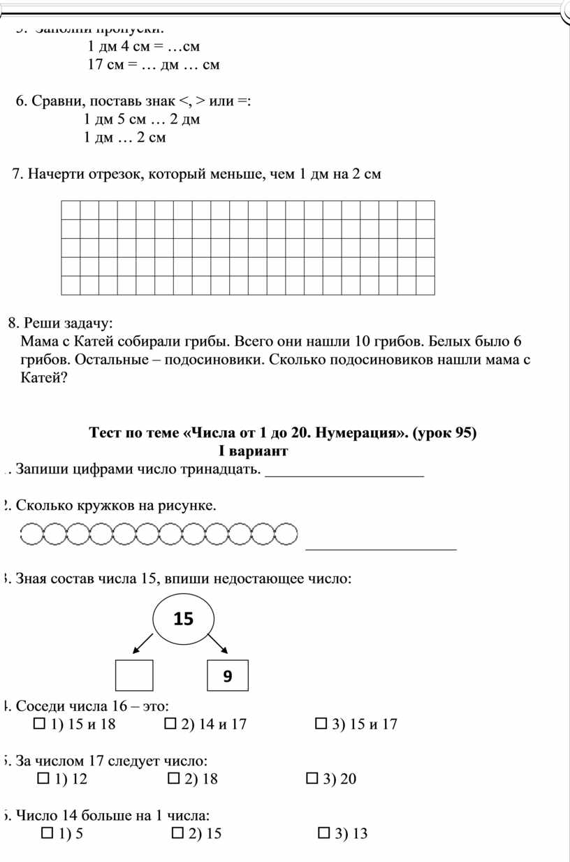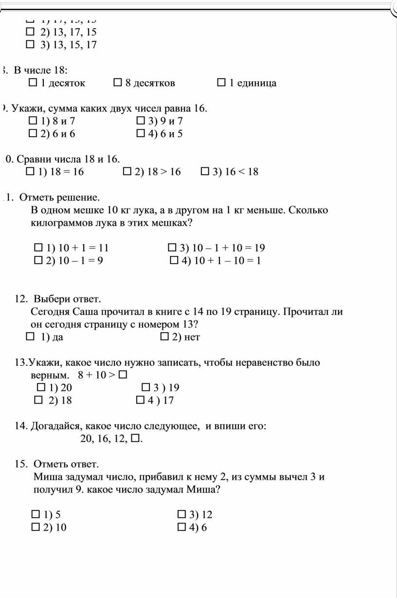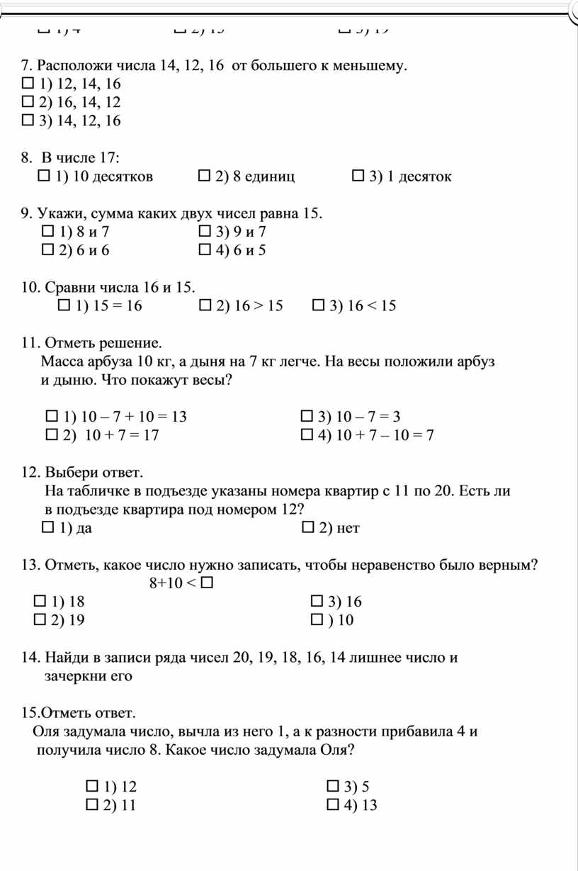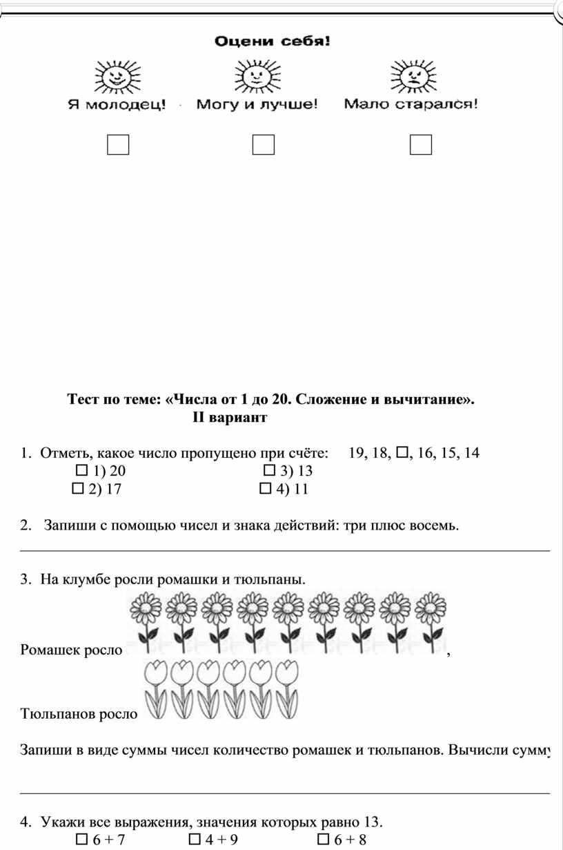15. Тест по теме: «Числа от 1 до 20. Сложение и вычитание»……….41-44 стр.