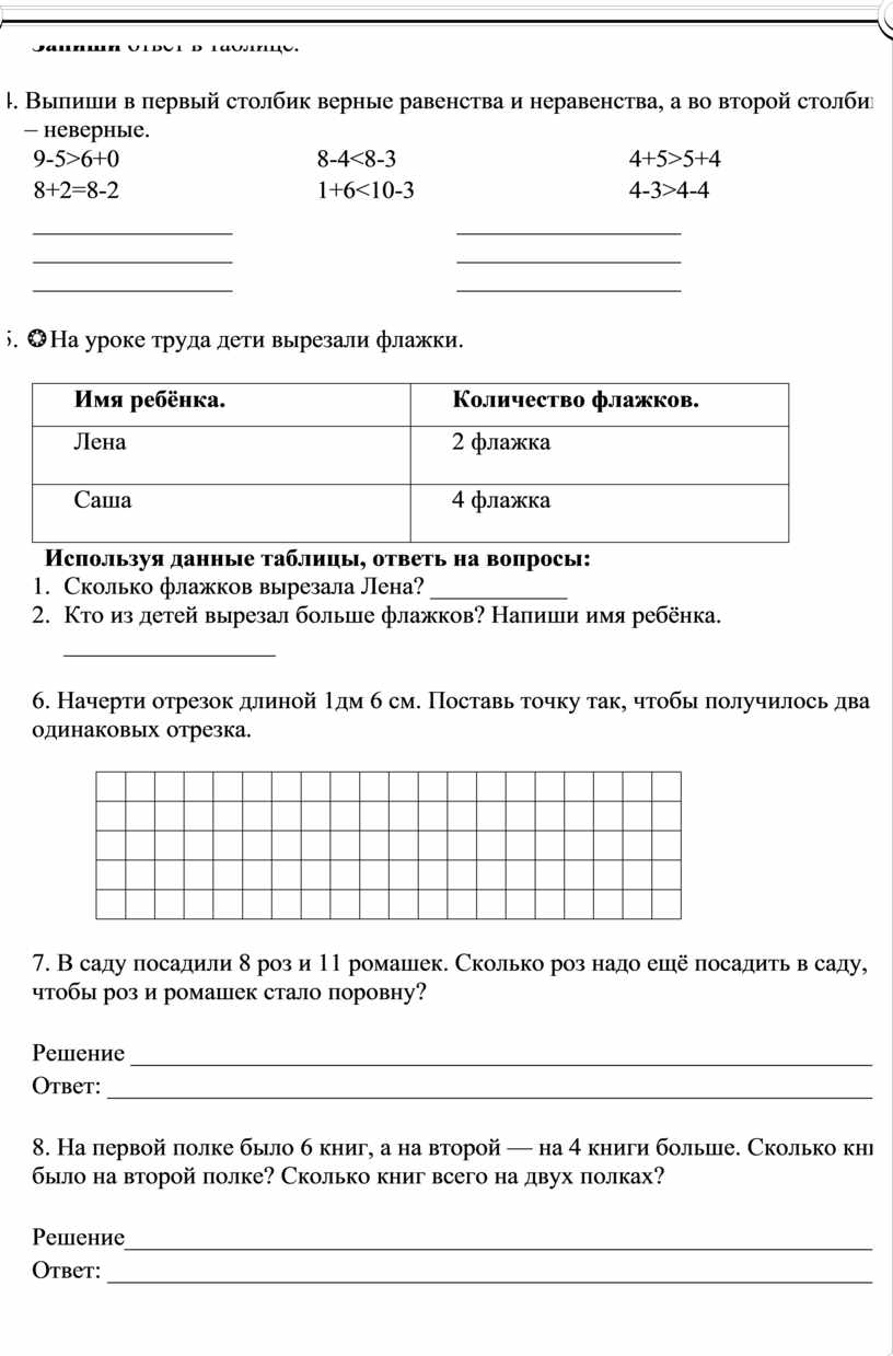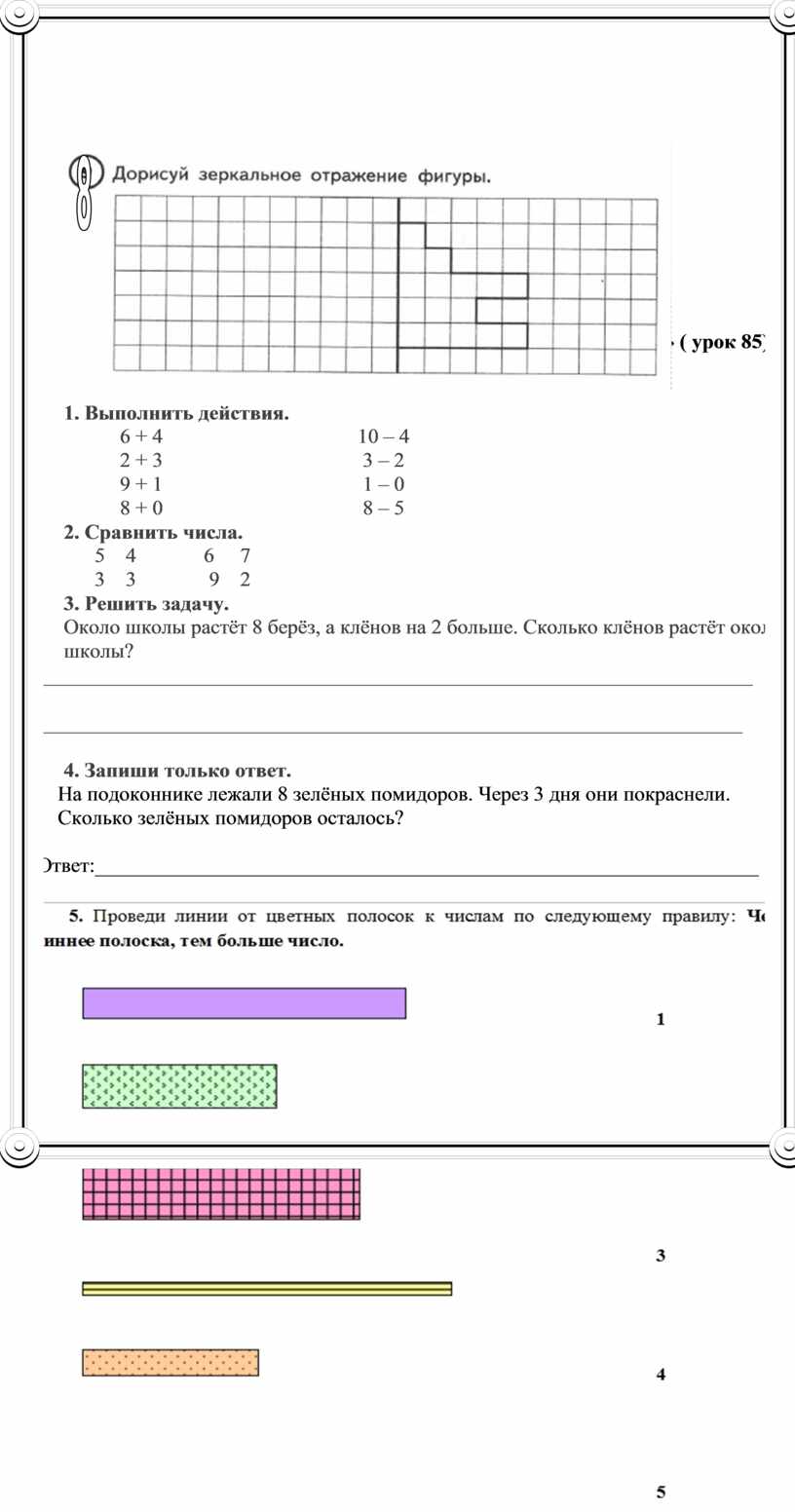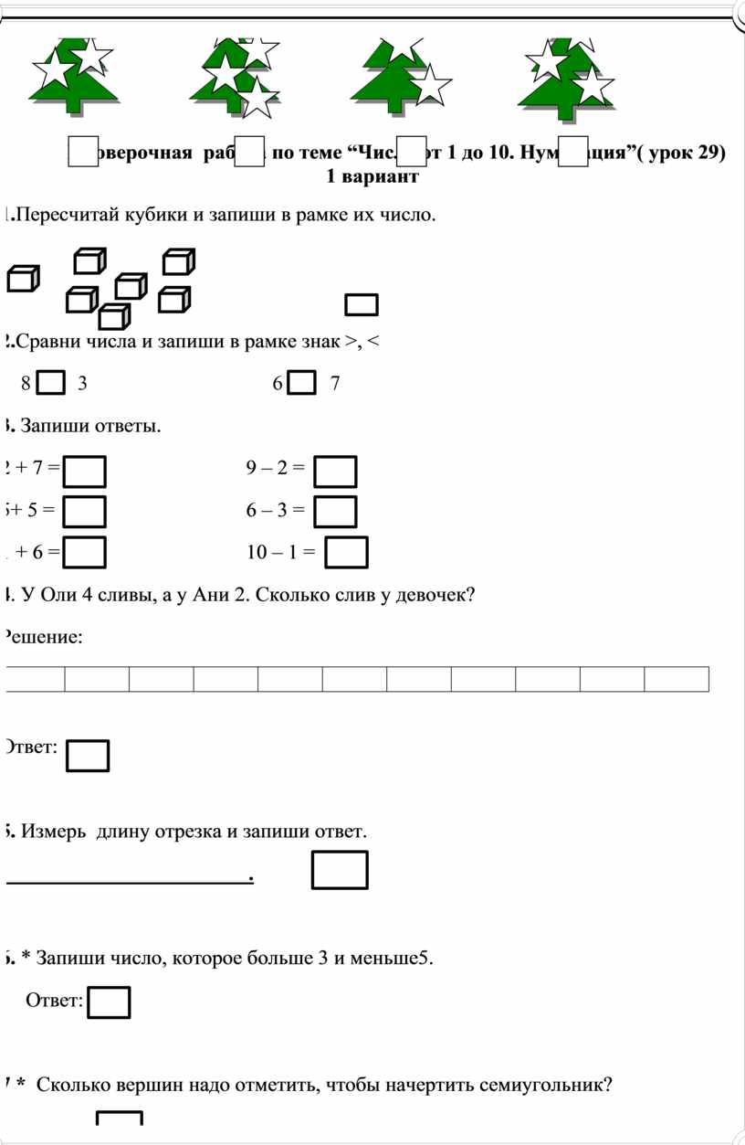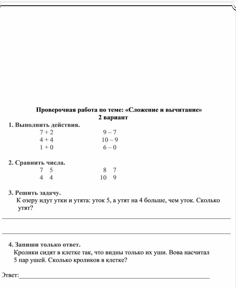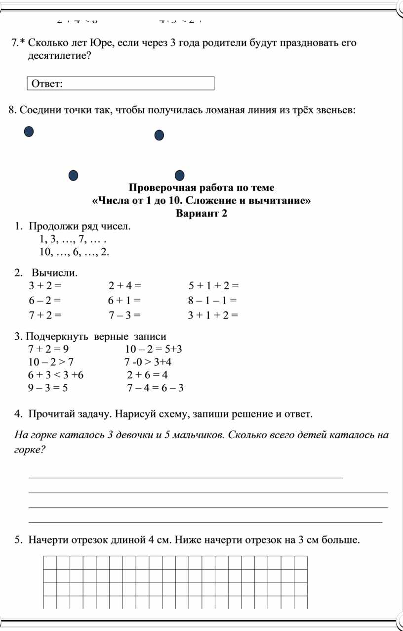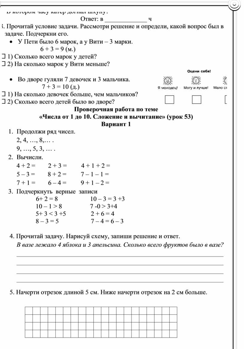 Проверочная работа по теме «Числа от 1 до 10. Сложение и вычитание»