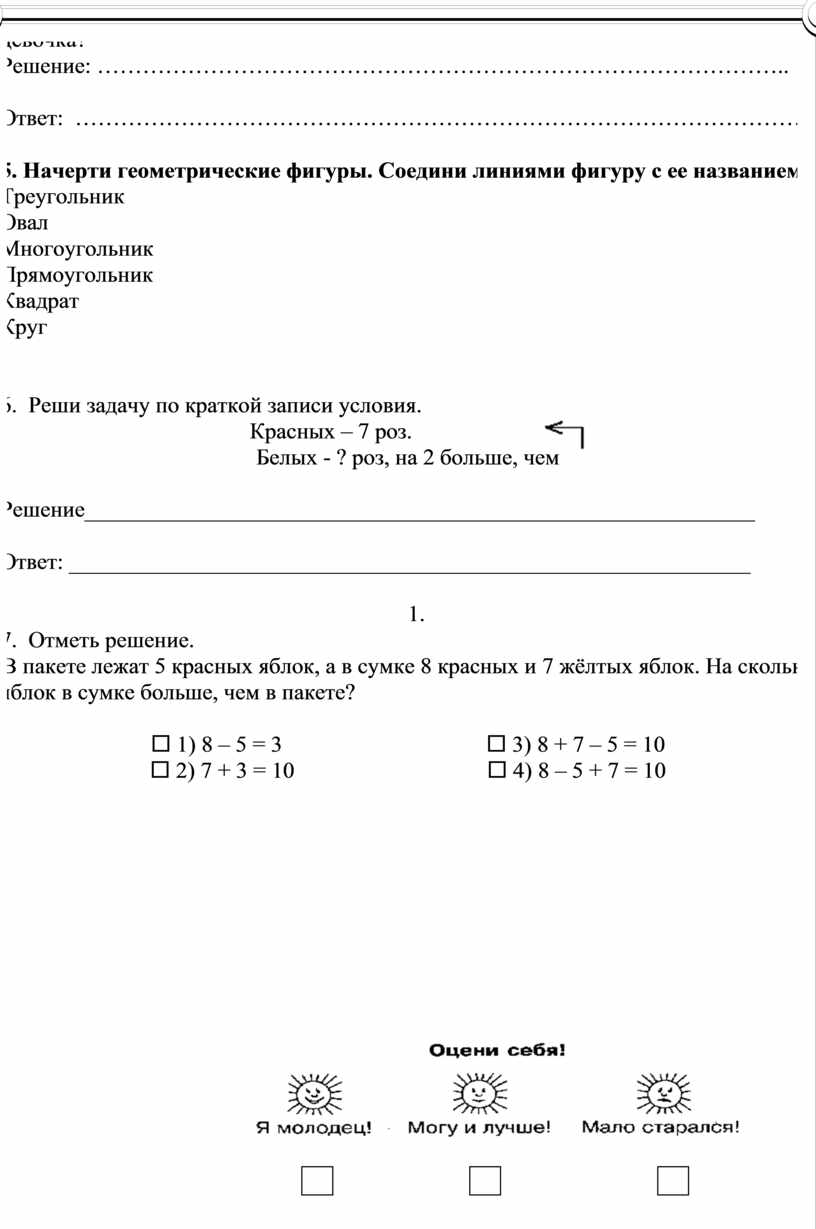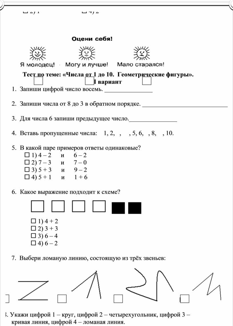 5. Тест по теме: «Числа от 1 до 10. Геометрические фигуры»…….15-18 стр.