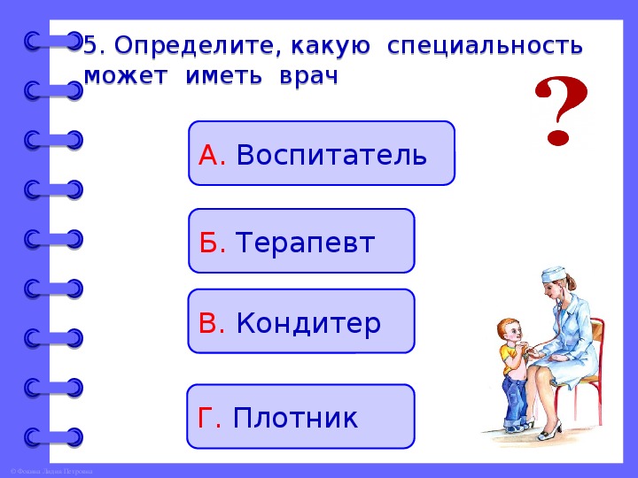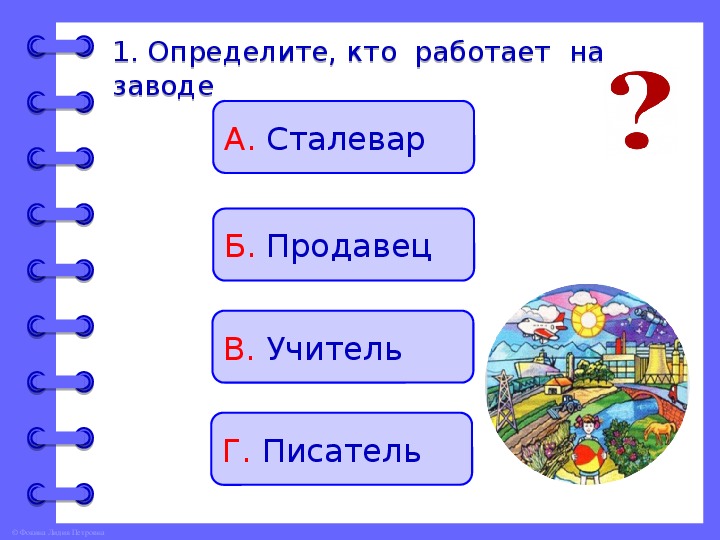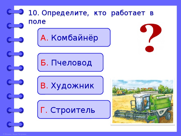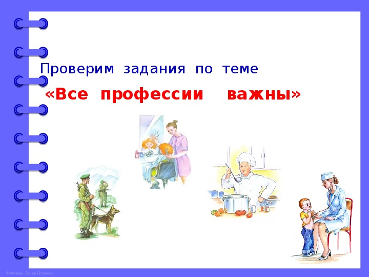 Презентация содержит 10 проверочных заданий со слайдами для проверки выполненного при изучении темы "Все профессии важны" по разделу "Жизнь города и села" по учебнику А. А. Плешакова по УМК "Школа России". Данный ресурс может тиражироваться для индивидуальной самостоятельной работы обучающихся в домашних условиях.Презентация к уроку окружающего мира во 2 классе по УМК "Школа России"