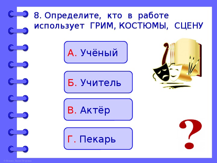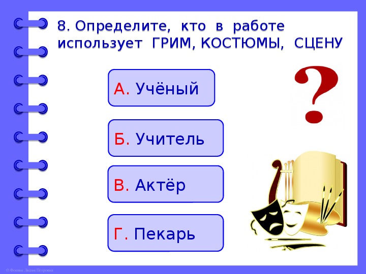 8. Определите, кто в работе использует ГРИМ, КОСТЮМЫ, СЦЕНУ