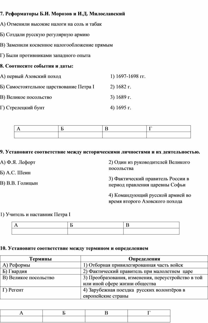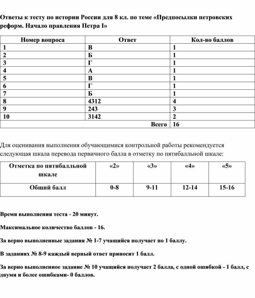 Ответы к тесту по истории России для 8 кл. по теме «Предпосылки петровских реформ. Начало правления Петра I»