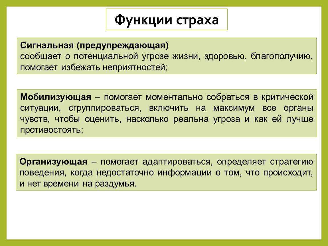 Мобилизующая – помогает моментально собраться в критической ситуации, сгруппироваться, включить на максимум все органы чувств, чтобы оценить, насколько реальна угроза и как ей лучше противостоять;