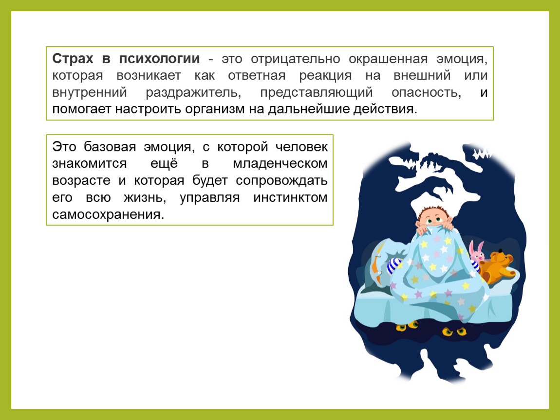 Страх в психологии - это отрицательно окрашенная эмоция, которая возникает как ответная реакция на внешний или внутренний раздражитель, представляющий опасность, и помогает настроить организм на дальнейшие действия.