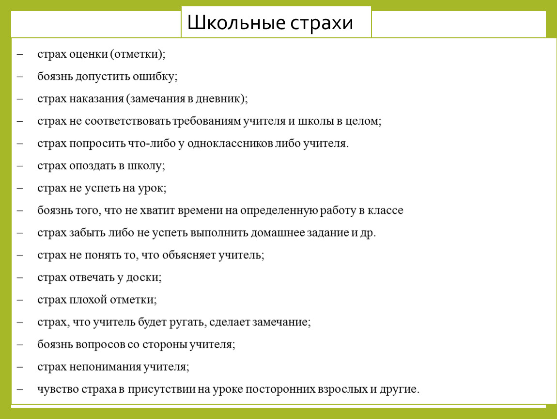 Страх перед школой. Этот страх может быть вызван проблемами в учёбе или отношениях с одноклассниками.
